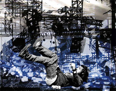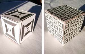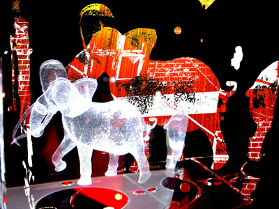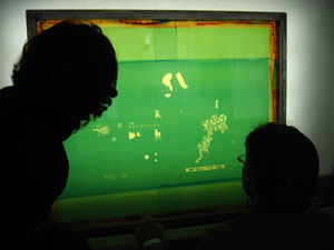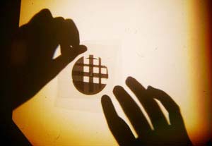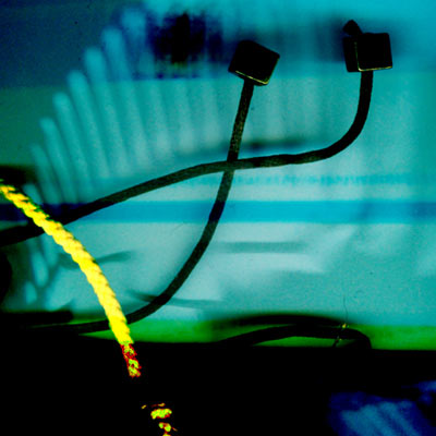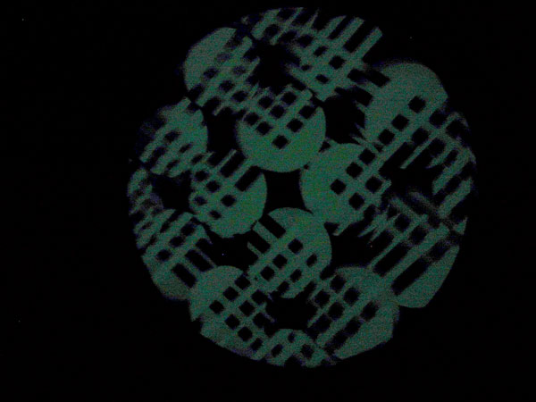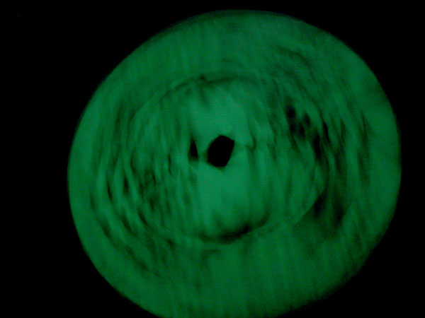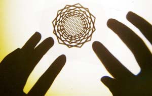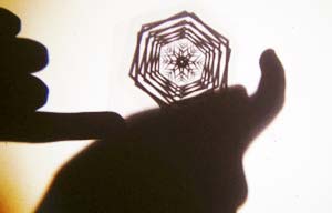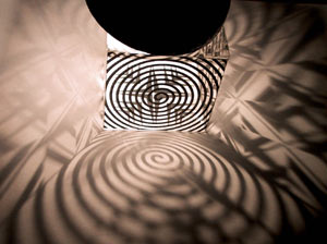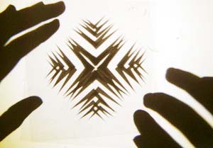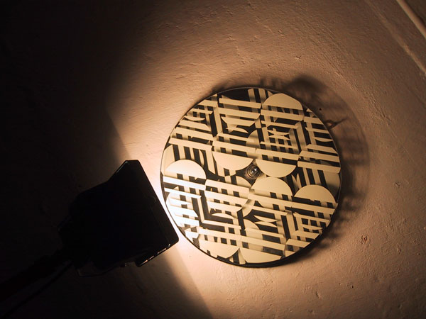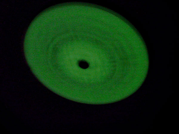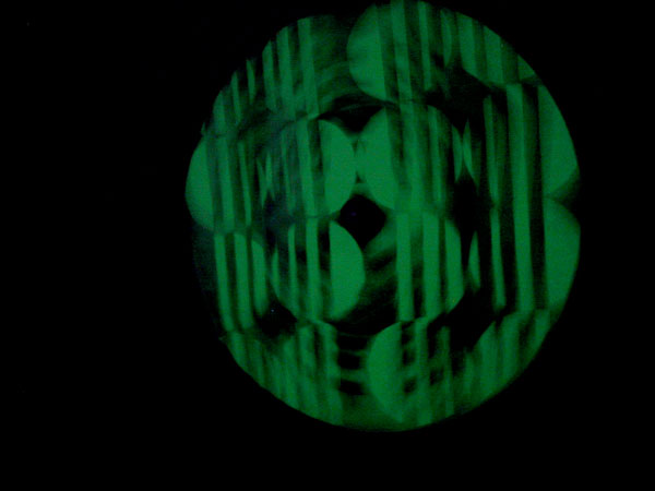 Grundprinzip meiner Fachprüfungsarbeit (schwarze Scheibe, darüber zwei Plexiglas-Scheiben beklebt mit fluoreszierender Folie, die manuell gegeneinander gedreht werden). Diese Animation stellt eine Art »Making of« der Schreibe dar. _Navigierbares »Making of« der Scheibe, damit einzelne Zwischenschritte/Muster besser zur Geltung kommen. _Rotierende Scheibe mit Musik hinterlegt, die auch bei der Präsentation im dunklen Bunker lief. Das Laden der SWF könnte aber etwas dauern, weil die Datei aufgrund der integrierten MP3 schlappe 7 MB groß is ;) |