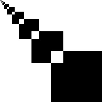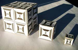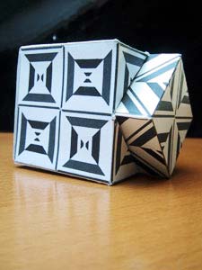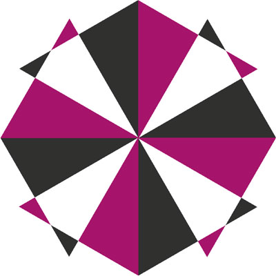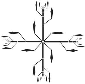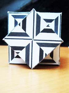 Zwei Strahlenkränze durchteilt von Quadratkonturen die gegeneinander gedreht werden. | |||||