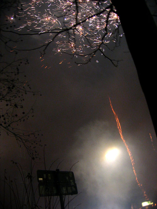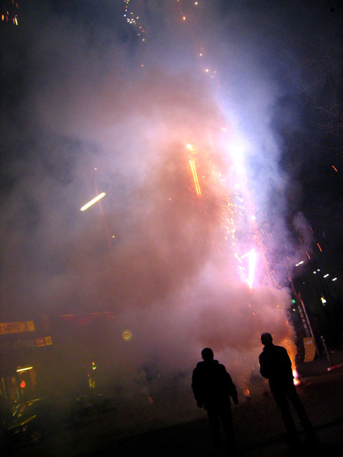 Vor lauter Funkenregen fängt ein Balkon direkt vor unserer Nase Feuer. Die Funken kamen aber nicht von uns!