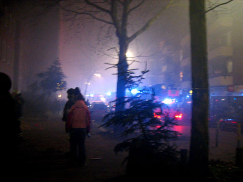 Kurz darauf treffen gleich drei Feuerwehrwagen ein, die den Ernst der Lage entweder überschätzt hatten oder von drei verschiedenen Personen gerufen worden waren. Der Brand war allerdings schon von einem beherzten Balkon-Kletterer gelöscht worden.